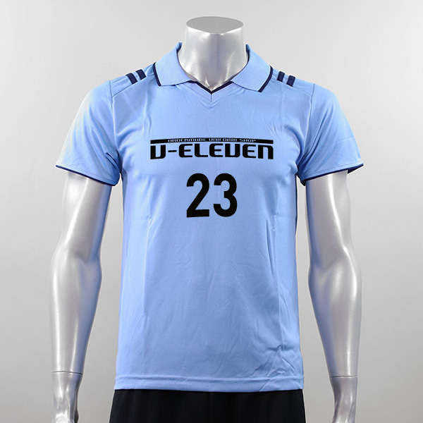 水色&首から脇に白い切り替えを入れたユニに胸・背番号とチーム名が入ったセット。