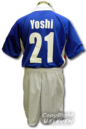 青をベースにしたサッカーユニフォーム。サイドには白と赤が入っています。