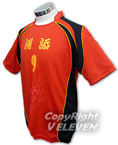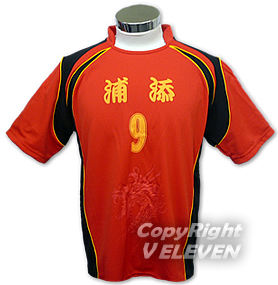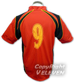 赤をベースにしたサッカーユニフォーム。サイドと肩に黒のラインが入っています。