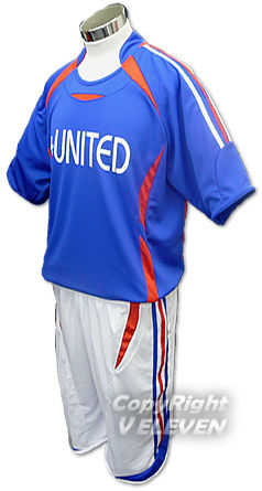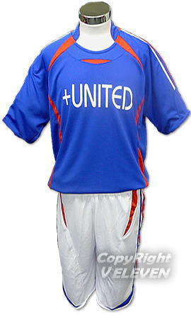 青をベースに、赤と白のラインが入るトリコロールカラーのサッカーユニフォーム。