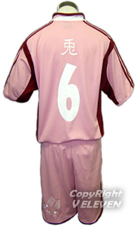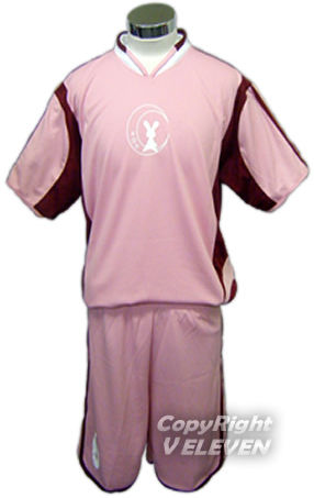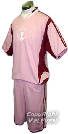 薄いピンクの桜色と、同系のエンジを組み合わせた美しいサッカーユニフォーム。