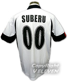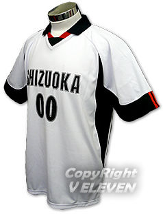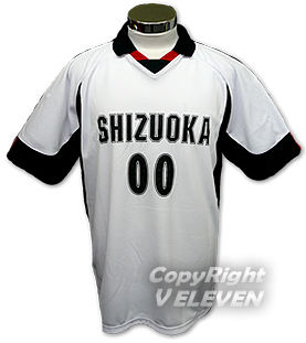 白をベースにしたサッカーユニフォーム、エリと袖、脇に黒が入り、首元と袖先に赤のラインが入っています。