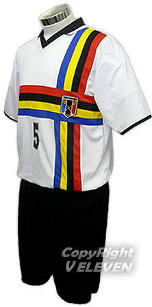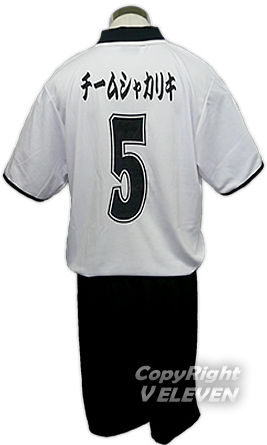 白をベースに、首元とエリ、袖に黒を入れるオーソドックスなデザインのサッカーユニフォームです。