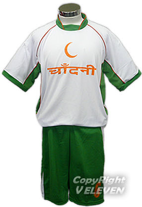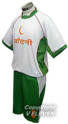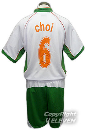 白をベースに、緑が入るサッカーユニフォーム。白と緑の間に、オレンジのパイピング加工が入っています。