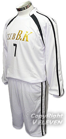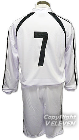 白をベースに、袖と胸に黒のラインが入るサッカーユニフォーム。