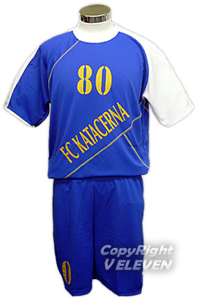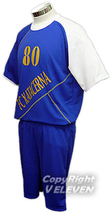 シンプルな色使いですが、肩から背中にかけて切り替えを入れ、さらに胸のチーム名、胸番号、背番号を斜めに入れることで、デザイン性の高いおしゃれなサッカーユニフォームとなっています。またチーム名や背番号にゴールドを使うことも効果的になっています。