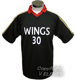黒をベースにしたサッカーユニフォーム。首元とエリには赤、肩には黄色でラインが入っています。