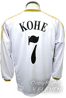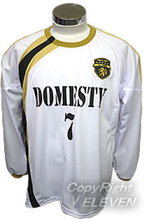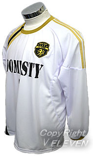 白がベースのサッカーユニフォーム。ゴールドと黒のラインが首元から右側に入っています。