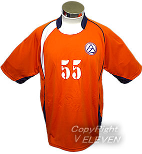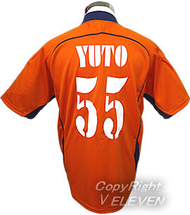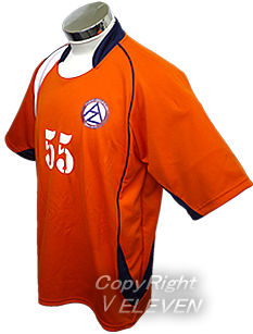 オレンジ(橙)をベースにしたサッカーユニフォーム。そこに紺のライン・エリ・袖と白のラインが入っています。