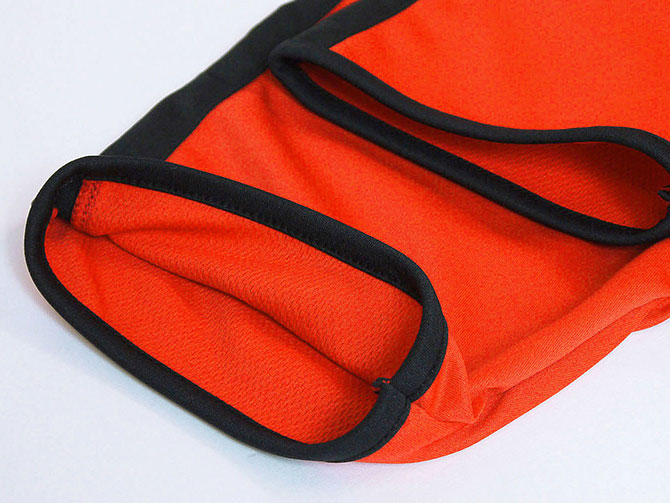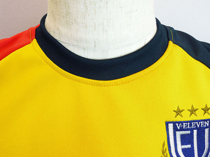 やもすれば、直線的なカットや縫製だけになりがちなサッカーユニフォームですが、そこに曲線を入れてみると、意外なほどお洒落なボディが完成します。 前面から背面にかけて、サイドはS字を描くような曲線処理。 ここも縫い目は手を抜かず、パイピング処理が施されています。 袖口も半分だけ生地を縫い合わせ、角を落としました。 手の込んだ縫製が特徴のプレミアムボディです。 |